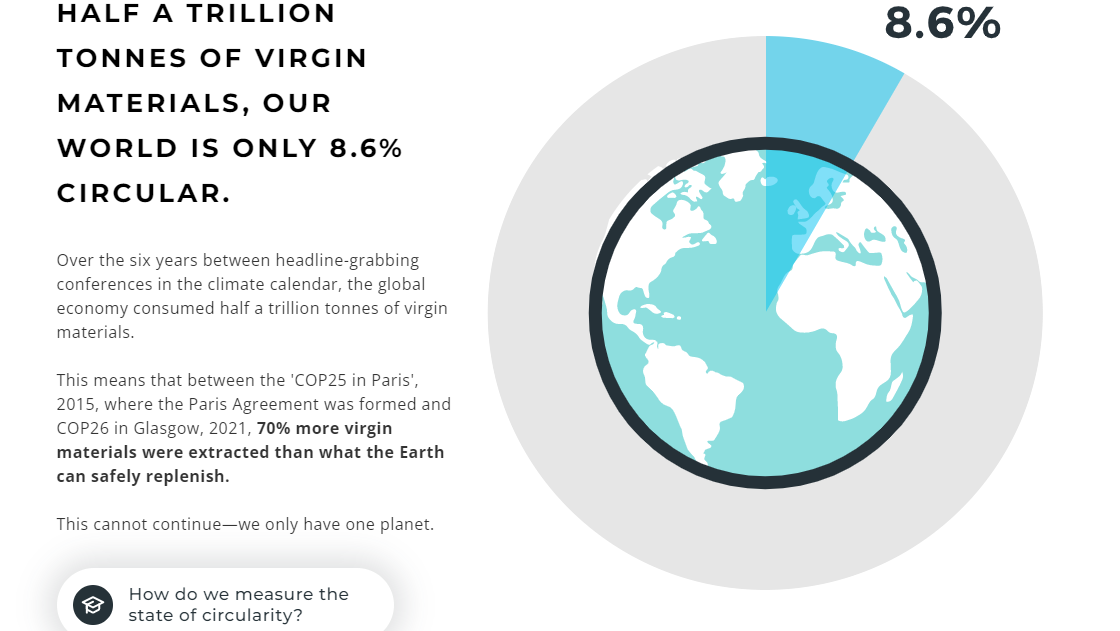 Vuonna 2022 käytetyistä raakamateriaaleista päätyi kierrätykseen 8,6%, tämä on todella vähän verrattuna siihen, mitä sen pitäisi olla ( Lähde https://www.circularity-gap.world/2022)