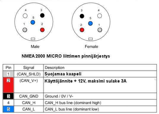 Joskus on hyvä tietää, mikä on oikea pinnijärjestys kaapeleissa, esimerkiksi vianhaun vuoksi tai jos olet kytkemässä ns. kenttäliitettävää NMEA 2000 liitintä. Monissa tapauksissa valmiiksi paistettu kaapeli joudutaan katkaisemaan, jotta se saadaan pujotettua ahtaan paikan läpi, jolloin kaapelin päähän tehdään uusi liitin.