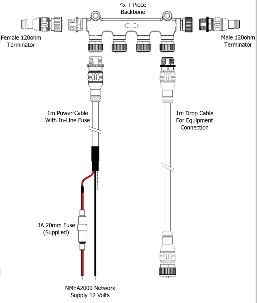 Monet valmistajat tarjoavat verkon rakentamiseen aloituspakkausta, jossa on yleensä muutama T-liitin, virran syöttö ja päätevastukset sekä pari kaapelia runkoon tai droppiin käytettäväksi. Jos veneessäsi ei ole entuudestaan verkkoa, on tällainen pakkaus hyvä verkon rakentamisen aloittamiseen.