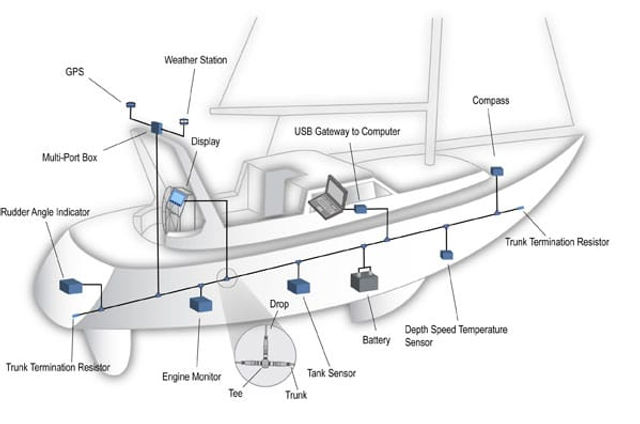 Isommassa matkaveneessä tilanne sen sijaan voi olla toinen. Alla esimerkkinä purjevene, jossa on aika tyypillinen kuvaus siitä, miten verkkoa joudutaan rakentamaan veneeseen. Ajatus kannattaa lähteä siitä, mitä kohteita veneessä on, mitkä liittyy NMEA 2000 verkkoon. Esimerkiksi plotterit, anturit, mittarit jne., ja miten ne sijoittuvat veneessä. Sähkön syöttö kannattaa sijoittaa väylän puolivälin vaiheille niin, että jännitepudotus ei ole liian iso väylän kummassakaan päässä. Samoin esimerkiksi ohjauspisteille navigaattorin pöydälle ja erilaisiin teknisiin tiloihin kannattaa aina sijoittaa ylimääräisiä T-haaroja, mahdollisia tulevia liitoksia varten. NMEA 2000 verkon pieni haaste on se, että kaapelit ovat usein "tehtaan mittaisia" ja harva jaksaa alkaa veistämään niitä lyhemmäksi. Ylimääräiset kaapelipituudet kannattaa hukata ennemmin matkalle, kuin kaikkia yhteen sähkökaappiin, ellet sitten lähde katkomaan kaapeleita.