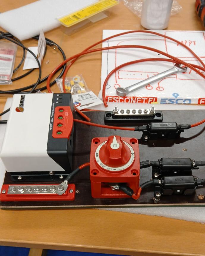- Aurinkoenergiaa ladataan akkuihin aurinkopaneelista SRNE Moonshine MPPT -latausssäätimen kautta.