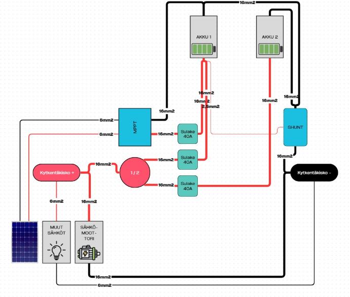 - Akkujen varaustasoa valvotaan SRNE Smart 500A -shuntilla Bluetoothin kautta.