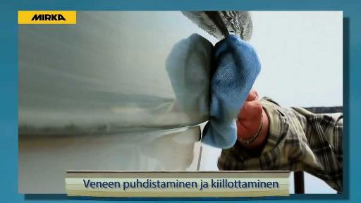 Ota kiillotuskone ja laita siihen matalat kierrokset, noin 800-1000 kierrosta. Laita laikaksi lampaanvillalaikka ja laita laikkaan kolme tippaa Mirka Polarshine 10 kiillotusvahaa. Levitä vaha ensin veneen kyljelle ennen koneen käunnistämistä painelemalla laikkaa veneen kylkeen kiinni. Lähde tämän jälkeen etenemään kylkeä tasaisella kahdeksikon radalla, pitäen huolen, että vaha ei pala kiinni veneen kylkeen. Jatka tällä keinoin koko hiomasi alue. Tarkkaile välillä pintaa ja huolehdi, että kylkeen ei jää ns. vapaapäiviä. Pyyhi runko ja tarkasta, että olet käynyt koko alueen huolellisesti läpi.